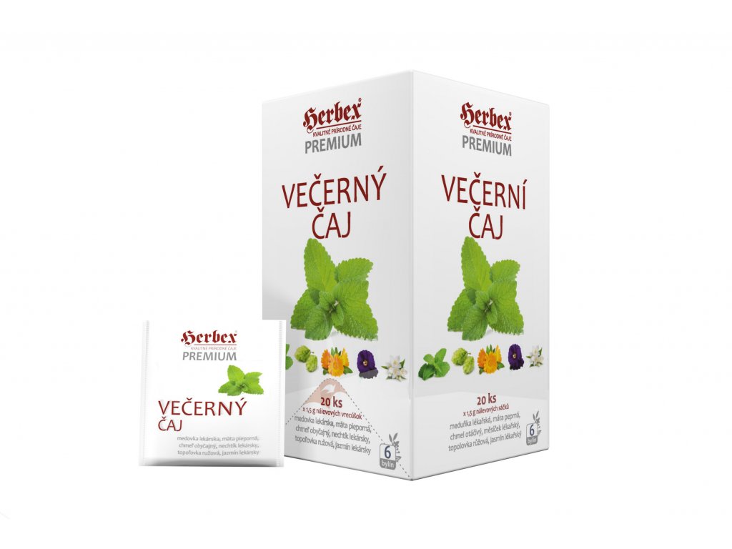 Meduňka lékařská (nať) 50%, máta peprná (nať) 20%, chmel otáčivý (plod) 10%, měsíček lékařský (květ) 8%, topolovka růžová (květ) 7%, jasmín lékařský (květ) 5%.
