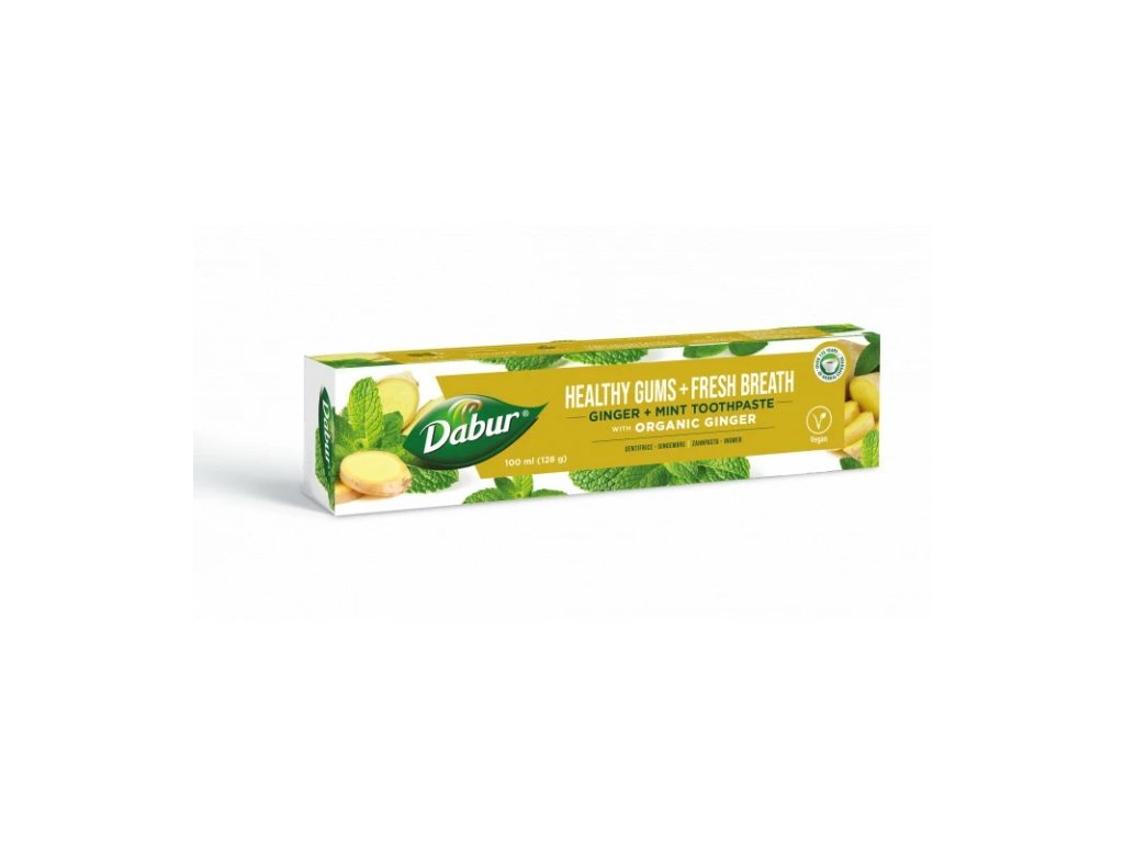 Zubní pasta Dabur s organickým zázvorem a mátou - Fresh Breath je unikátní zubní pasta, která kombinuje přirozené vlastnosti zázvoru s osvěžující recepturou, zajišťující zdraví ústní dutiny a dlouhotrvající svěží dech. Je navržen tak, aby přirozeně chránil zuby a dásně, má antibakteriální vlastnosti a účinně bojuje proti zubnímu plaku.