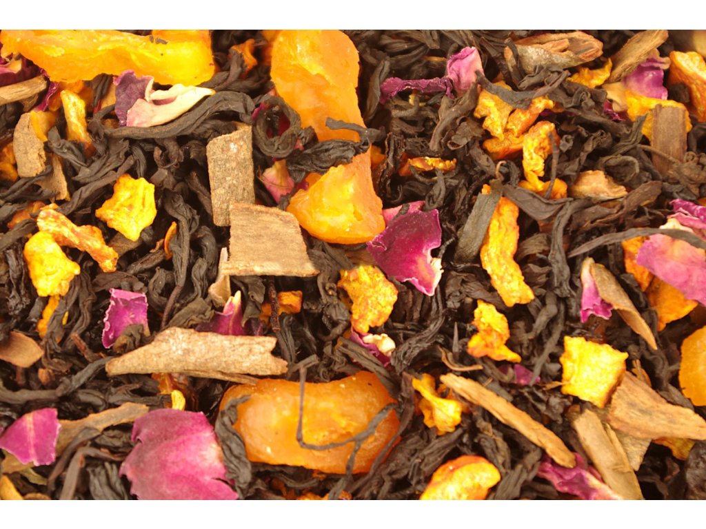 Černý čaj Assam FOP, sušené kostky dýně, sušená meruňka, kousky skořice, přírodní aromata, okvětní lístky růže, pravá vanilka.